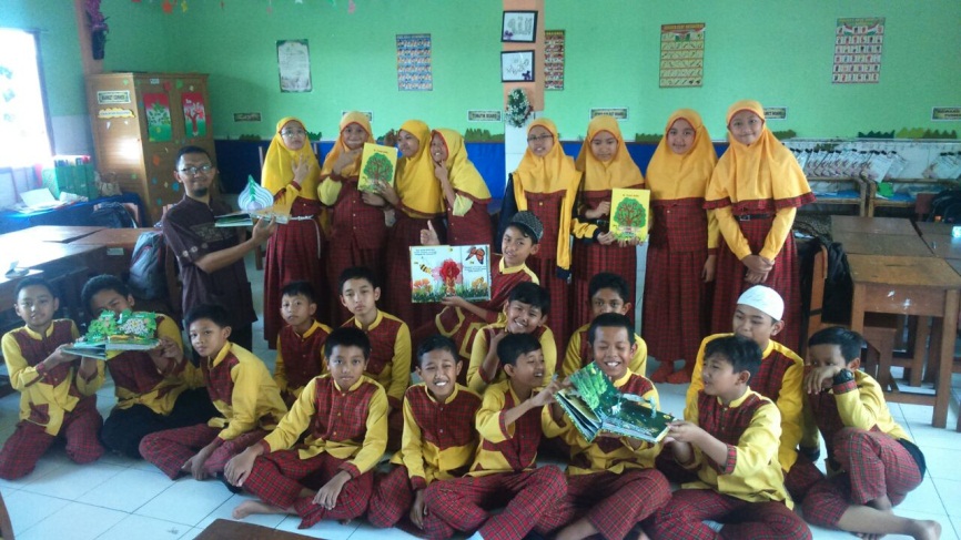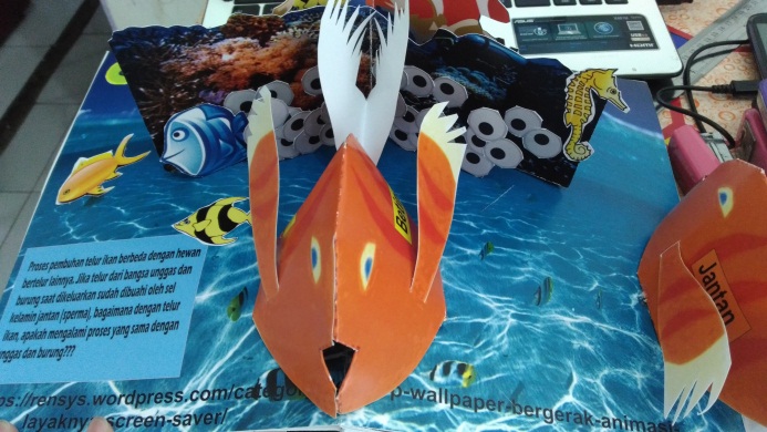 Cara perkembangbiakan hewan yang terdapat di dalam buku pop-up seperti yang terdapat pada Gambar 2. Terdapat gambar ikan betina yang mengeluarkan telur dan tersimpan di batu-batu karang. Kemudian ikan jantan menghampiri telur-telur tersebut dan mengeluarkan sel kelamin jantannya, sehingga akan terjadi pembuahan di luar tubuh induknya. Proses bertemunya telur betina dan proses perkembangbiakannya tidak dijelaskan dalam buku, melainkan siswa menjelaskan dengan kemampuan bernalarnya dengan bantuan gambar yang terdapat dalam buku pop-up. Pembelajaran tentang perkembangbiakan tumbuhan dan hewan dengan melatih kemampuan bernalar siswa, sudah pernah dilaksanakan di SDI Surya Buana Malang dengan sasaran siswa kelas VI (Gambar 5).