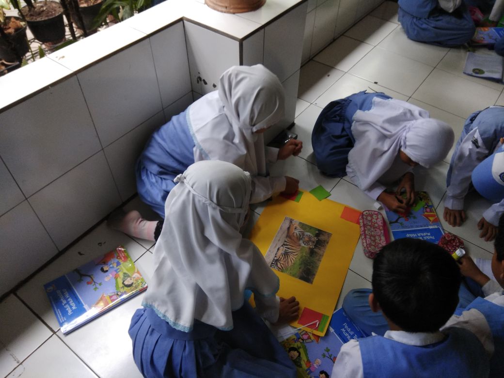 Terlebih dahulu Guru membagikan gambar hewan-hewan langka sesuai dengan nama kelompok masing-masing. Ada Burung Cenderawasih, Jalak Bali, Orangutan, Harimau Sumatra, dan Komodo. Mengapa nama kelompoknya adalah hewan-hewan langka? Karena mereka sedang belajar tentang Tema Peduli Terhadap Makhluk Hidup. Langkah selanjutnya guru membagikan kertas asturo dengan warna yang berbeda-beda. Ini adalah salah satu hal untuk menarik konsentrasi siswa. Sebelum menjadi penjual dan pembeli, masing-masing kelompok harus menempelkan gambar hewan yang dibagikan oleh guru pada kertas asturo yang telah disediakan. Kemudian siswa bersama kelompoknya akan menuliskan pertanyaan 5W+1H dan melakukan wawancara kepada teman sekelompoknya untuk mendapatkan jawaban. Pertanyaan-pertanyaan tersebut harus berkaitan dengan Peduli Terhadap Hewan Langka sesuai dengan nama kelompok dan gambar hewan yang telah dibagikan. Antara gambar, pertanyaan, dan jawaban tersebut ditata sedimikian rupa sehingga seperti membentuk mindmap.