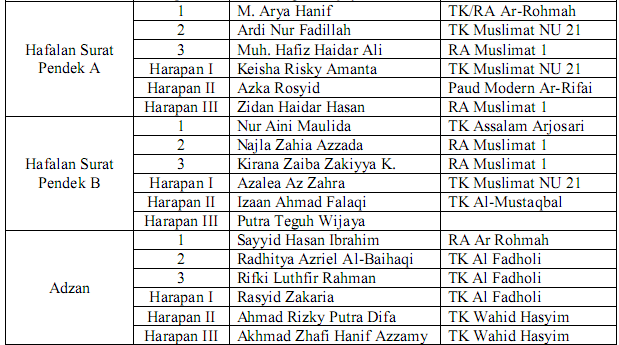 Jenis perlombaan yang terdapat dalam kegiatan ini ada 6 lomba yang sangat seru dan juga mendidik pastinya. Lomba-lomba tersebut adalah hafalan surat pendek, hafalan doa sehari-hari, adzan, cerdas cermat, olimpiade matematika, dan mewarna. Tak ada satu pun jenis lomba yang tidak diminati. Akan tetapi, yang paling diminati oleh peserta adalah lomba mewarna, yang setiap tahunnnya selalu mendapatkan peserta lomba terbanyak.