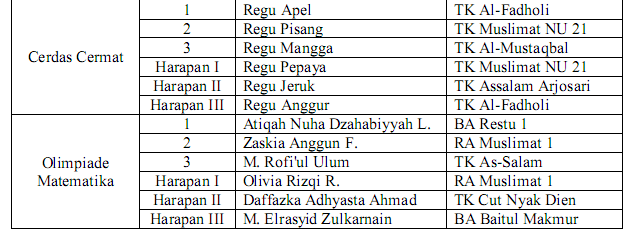 Adapun Juara Umum diraih oleh RA Muslimat NU 1 dengan total juara sebanyak 8 juara. Semoga dengan terselenggaranya kegiatan ini bisa turut serta mewujudkan generasi masa depan yang berakhlaqul karimah. Sampai bertemu di Gebyar Kreativitas Anak Muslim 2019!
